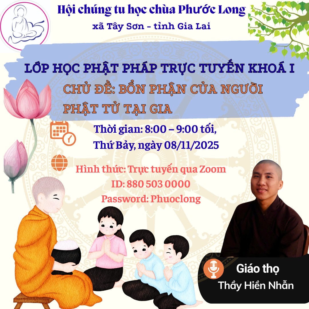 Vào lúc 20:00 ngày 08/11/2025 (PL. 2569), Hội Chúng Tu Học chùa Phước Long đã trang nghiêm tổ chức buổi học trực tuyến của Lớp Phật Pháp Trực Tuyến – Khóa I với chủ đề: