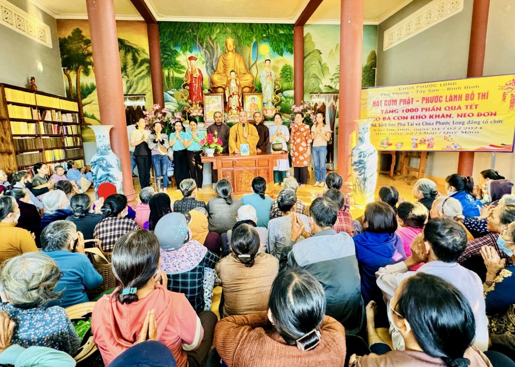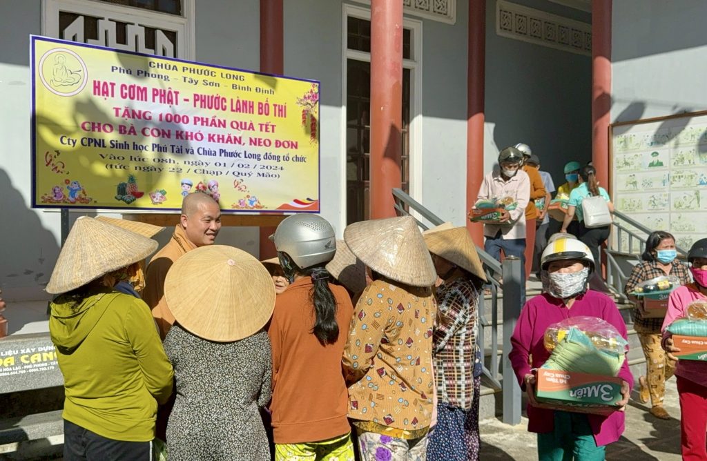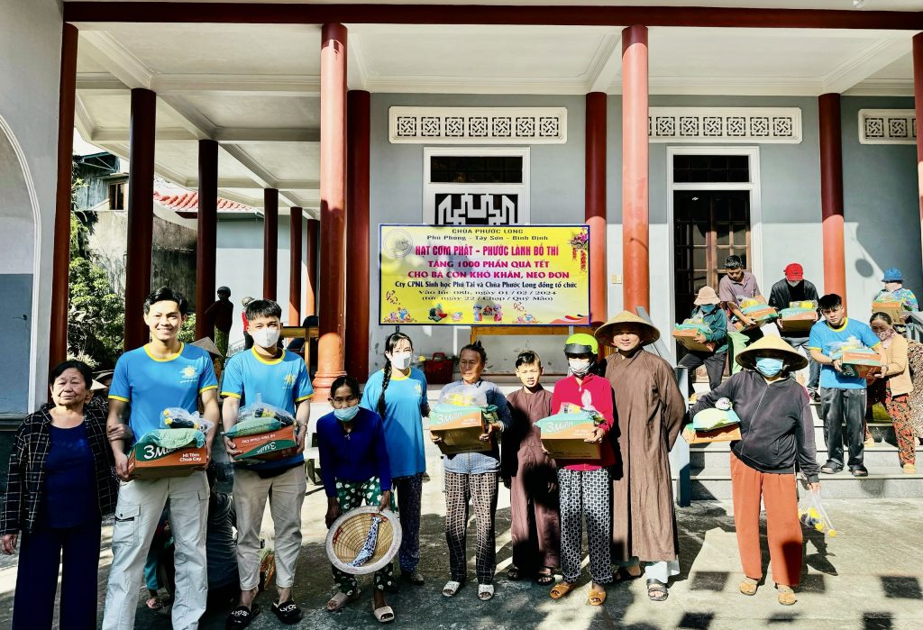 Ngày 01/2/2024, Phật lịch 2567 – Chùa Phước Long tại Phú Phong, Tây Sơn, Bình Định và Cty NLSH Phú Tài cùng Phật tử gần xa đã góp công, góp của: TẶNG 1000 (một ngàn) PHẦN QUÀ TẾT “Hạt Cơm Phật” Xuân GIÁP THÌN (2024) CHO BÀ CON KHÓ KHĂN, GIÀ, NEO ĐƠN. Mỗi phần quà gồm: Gạo, mì, xì dầu và dầu ăn; với tổng trị giá 200 triệu đồng.